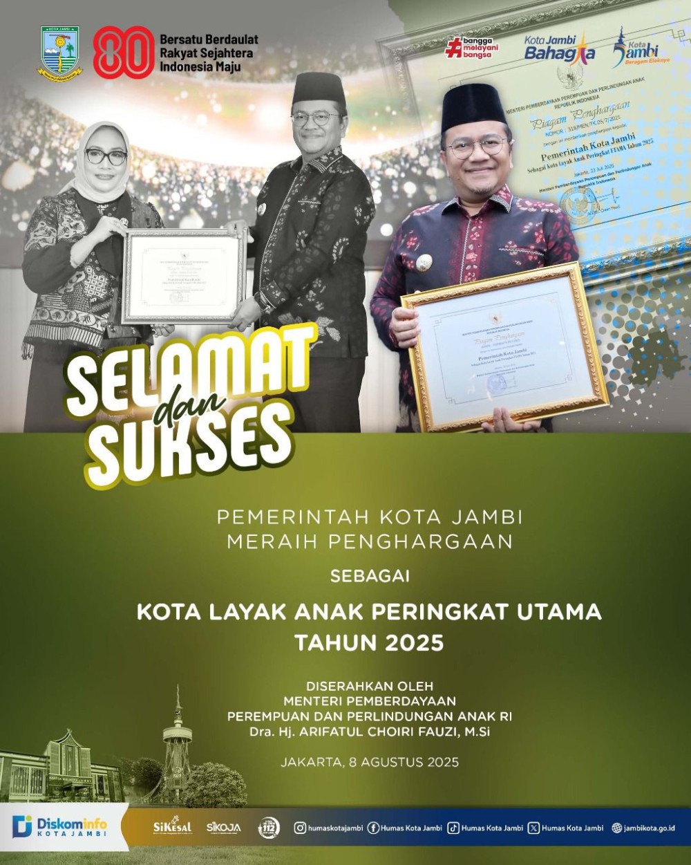 Dengan raihan ini, Kota Jambi semakin menegaskan dirinya sebagai kota yang tidak hanya maju dalam pembangunan fisik, tetapi juga unggul dalam membangun masa depan generasi penerusnya.