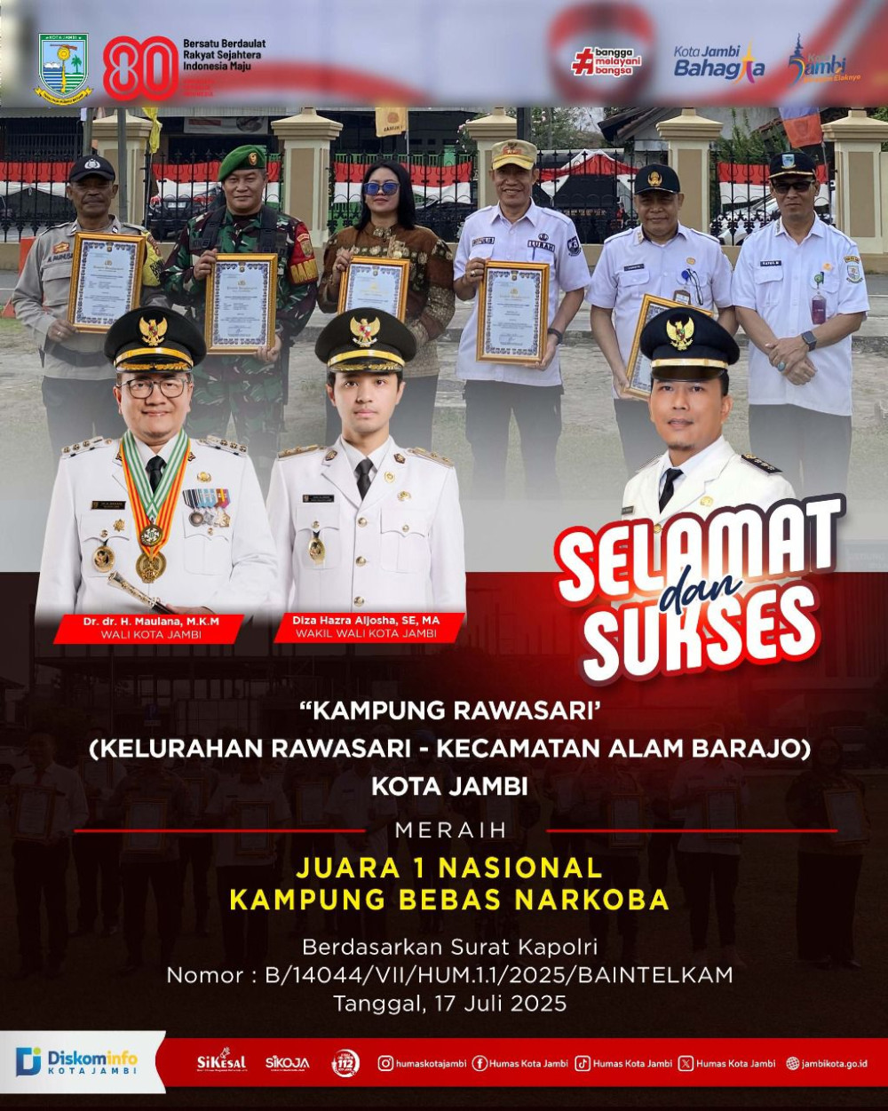 Terpisah, Wali Kota Jambi, Dr. dr. H. Maulana, M.K.M., turut mengapresiasi pencapaian ini. Menurutnya, penghargaan ini adalah bukti bahwa kerja kolaboratif antara pemerintah, TNI-Polri, dan masyarakat mampu menciptakan lingkungan yang aman, sehat, dan terbebas dari bahaya narkoba.