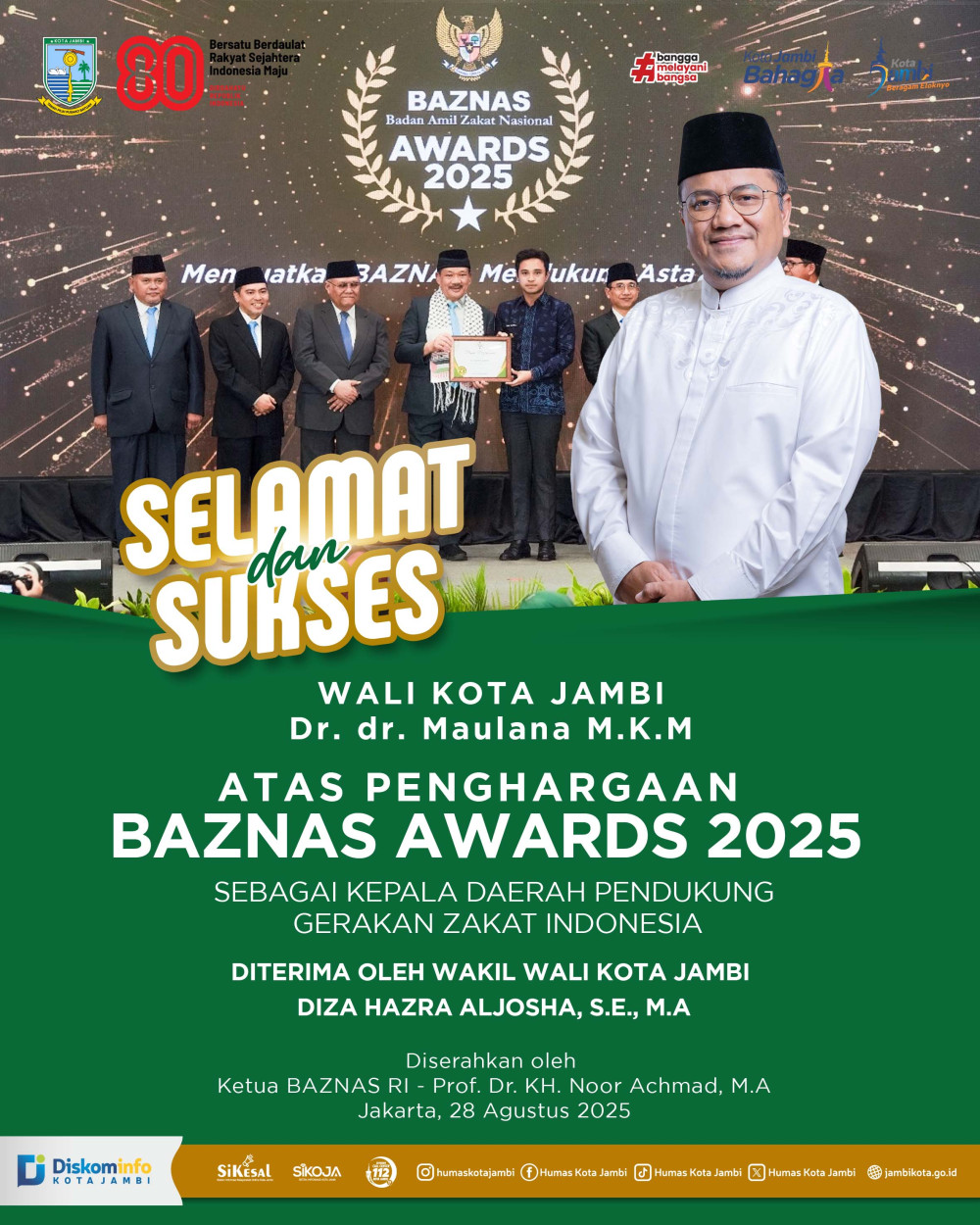 Jambinewsroom.com, Jambi - Kebijakan dan komitmen kuat Pemerintah Kota (Pemkot) Jambi dalam mendorong kebangkitan zakat di daerah kembali mendapat pengakuan di tingkat nasional. Wali Kota Jambi, Dr. dr. H. Maulana, M.K.M, dinilai berhasil menghadirkan kebijakan strategis yang berdampak nyata bagi pengelolaan dan optimalisasi zakat di Kota Jambi. Atas peran penting tersebut, Wali Kota Maulana dianugerahi penghargaan bergengsi “Baznas Awards 2025” dari Badan Amil Zakat Nasional (Baznas) Republik Indonesia.