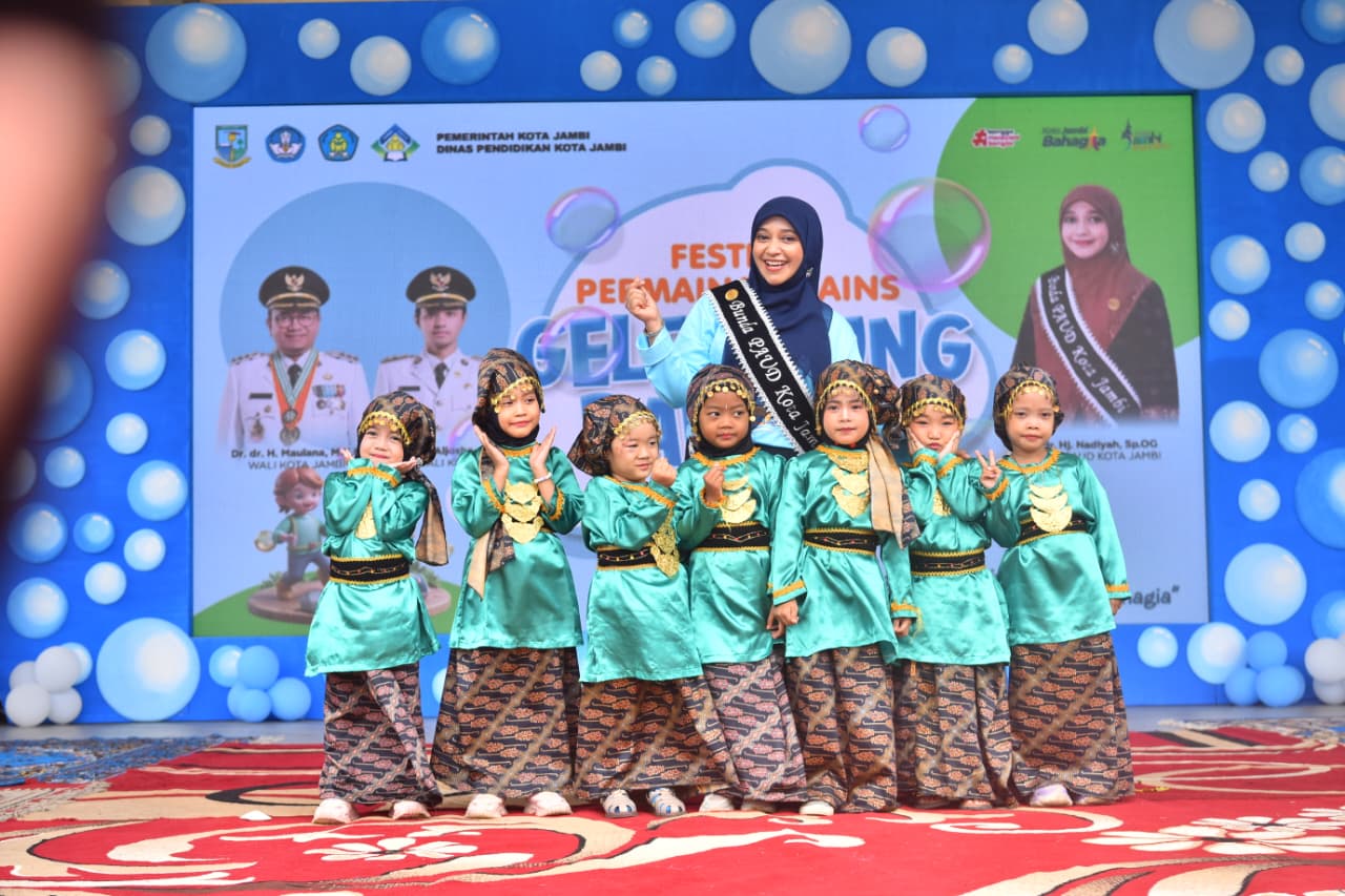 Sementara itu, Bunda PAUD Kota Jambi, Dr. dr. Hj. Nadiyah Maulana, Sp.OG., menyampaikan bahwa Festival Permainan Sains ini menjadi sarana penting untuk menstimulasi kemampuan anak melalui konsep bermain yang perlu diperkenalkan sejak usia dini.