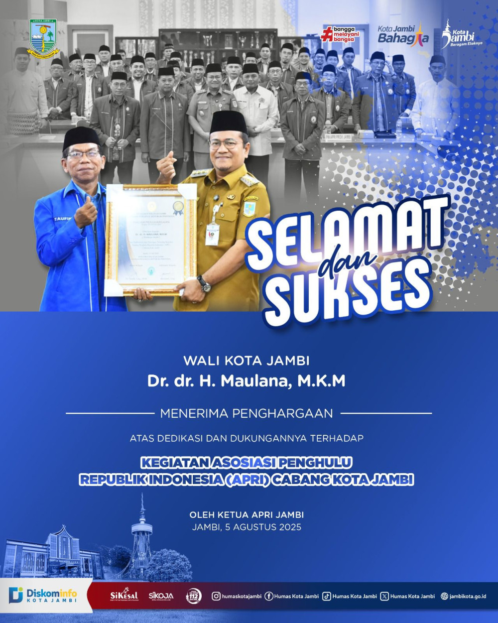 Jambinewsroom.com, Jambi - Wali Kota Jambi, Dr. dr. H. Maulana, M.K.M, dianugerahi piagam penghargaan dari Asosiasi Penghulu Republik Indonesia (APRI) Provinsi Jambi. Wali Kota Jambi itu dinilai berdedikasi dan memberikan dukungan penuh terhadap pelayanan kepenghuluan di Kota Jambi.