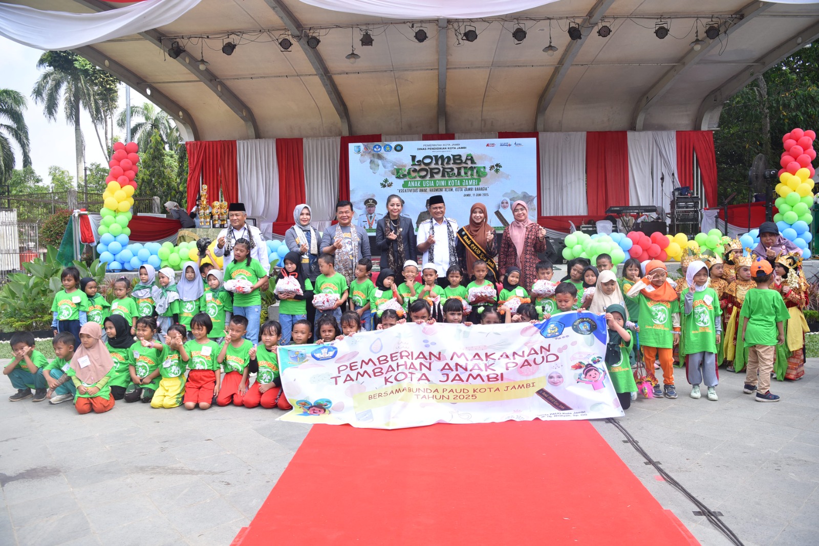 Pada kesempatan itu, juga dilakukan penyerahan simbolis Pemberian Makanan Tambahan (PMT) bagi anak-anak PAUD Kota Jambi sebagai bagian dari upaya pemerintah dalam menjamin kesehatan anak, mencegah stunting, dan mendukung kualitas layanan pendidikan sejak usia dini.