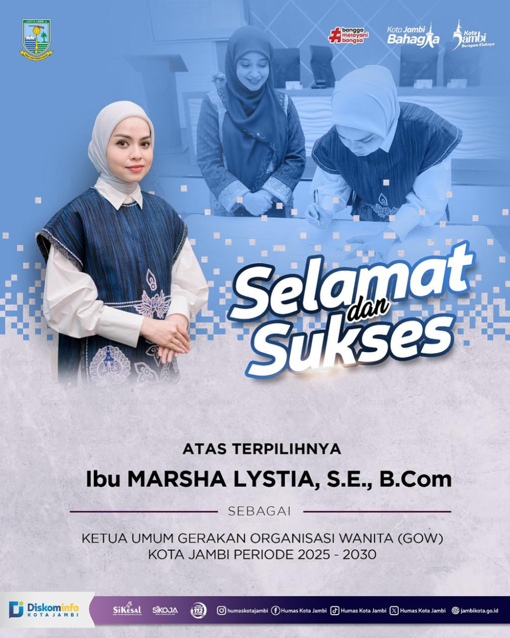 Jambinewsroom.com, Jambi - Marsha Lystia, S.E., B. Com., resmi pimpin Gabungan Organisasi Wanita (GOW) Kota Jambi. Ia terpilih secara aklamasi setelah forum Musyawarah Daerah Luar Biasa (Musdalub) GOW Kota Jambi Tahun 2025 yang berlangsung Senin (14/7/2025) di Aula PKK Kota Jambi memilihnya secara aklamasi untuk memimpin GOW Kota Jambi masa bhakti 2025-2030.