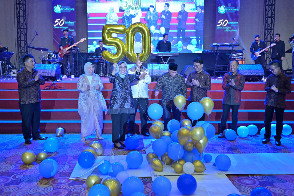 Jambi - Penjabat (Pj) Wali Kota Jambi, Sri Purwaningsih menghadiri acara Malam Puncak Hari Ulang Tahun Perusahaan Daerah Air Minum Tirta Mayang Ke-50 tahun 2024, bertempat di Ratu Convention Centre, Rabu (31/7/24).
