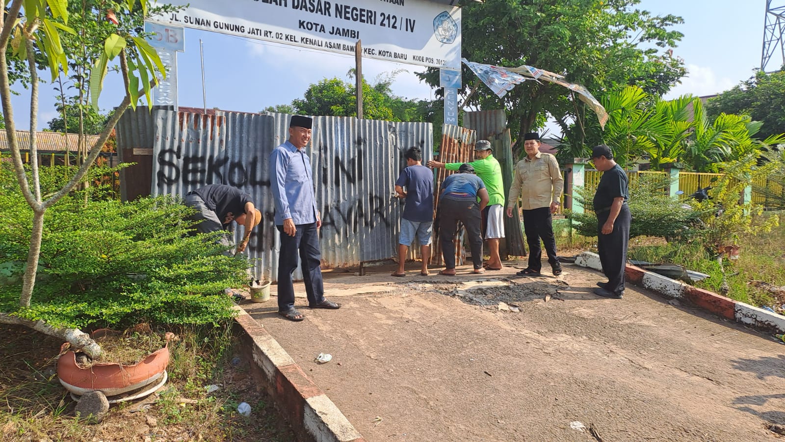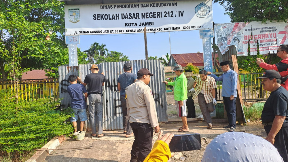 Jambinewsroom.com Jambi - Ahli waris tanah SDN 212 Kota Jambi akhirnya membuka pagar seng yang sempat terpasang beberapa waktu lalu di depan pintu gerbang masuk SD tersebut. Pembukaan pagar seng dilakukan pada Sabtu (13/7/2024) sore, sekitar pukul 15.30 WIB.