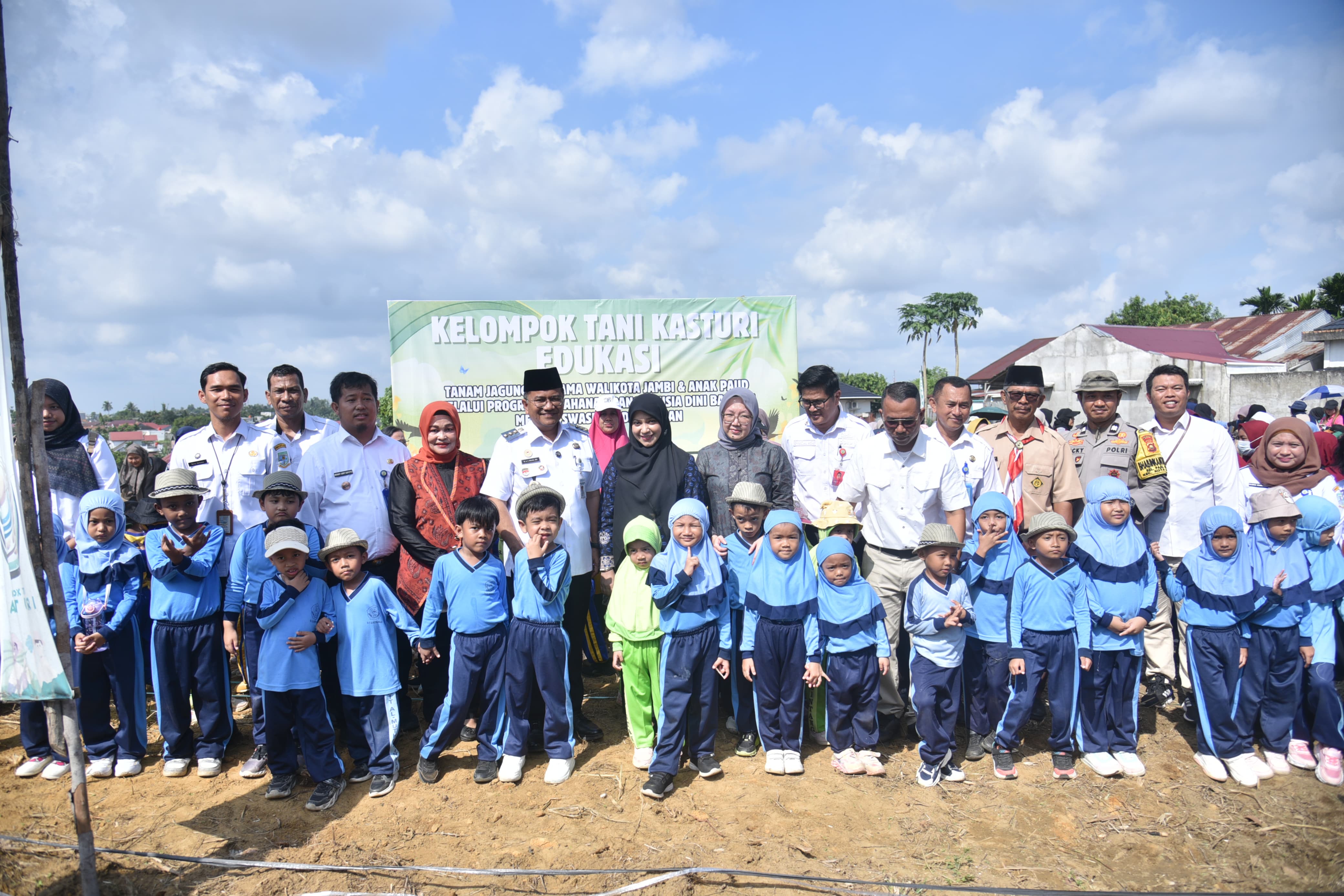 Secara simbolis, Wali Kota Maulana dan Bunda PAUD Kota Jambi bersama-sama melakukan penanaman jagung didampingi ratusan anak PAUD yang tampak ceria mengenakan atribut sekolah masing-masing.