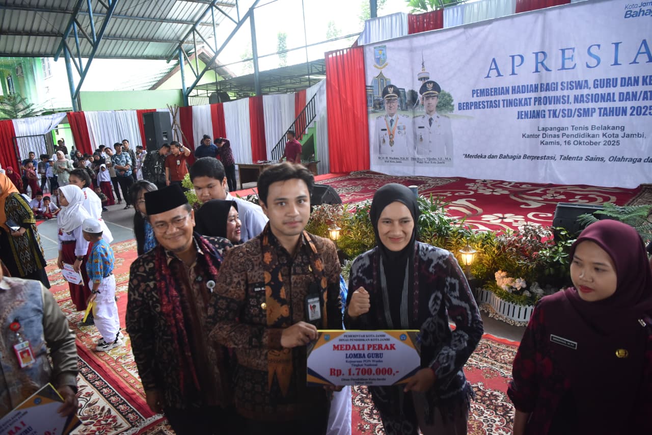 Jambinewsroom.com, Jambi – Sebagai bentuk apresiasi terhadap para Siswa, Guru dan Kepala Sekolah jenjang SD dan SMP berprestasi di tingkat Provinsi, Nasional hingga Internasional, Pemerintah Kota (Pemkot) Jambi melalui Dinas Pendidikan memberikan hadiah sebagai penghargaan, pada Kamis (16/10/2025) siang.