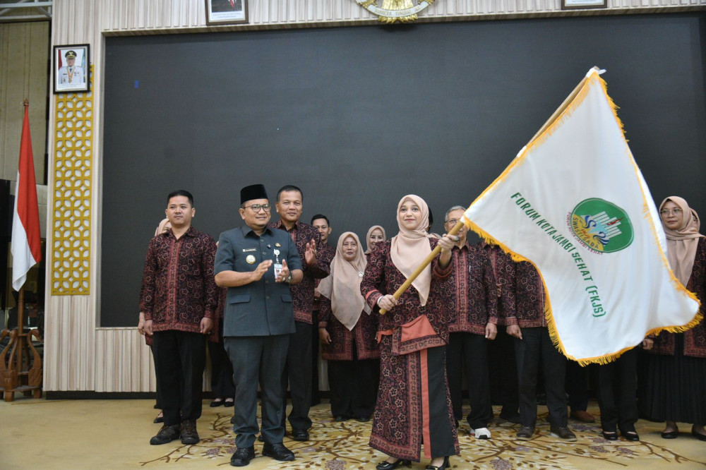 Prosesi pengukuhan ditandai dengan penyerahan bendera pataka kepada Dr. dr. Hj. Nadiyah Maulana, Sp.OG., yang dipercaya menjabat sebagai Ketua Umum FKJS Kota Jambi. Penetapan tersebut berdasarkan Surat Keputusan Wali Kota Jambi Nomor 365 Tahun 2025 tentang Pembentukan Forum Kota Jambi Sehat Periode 2025–2027.