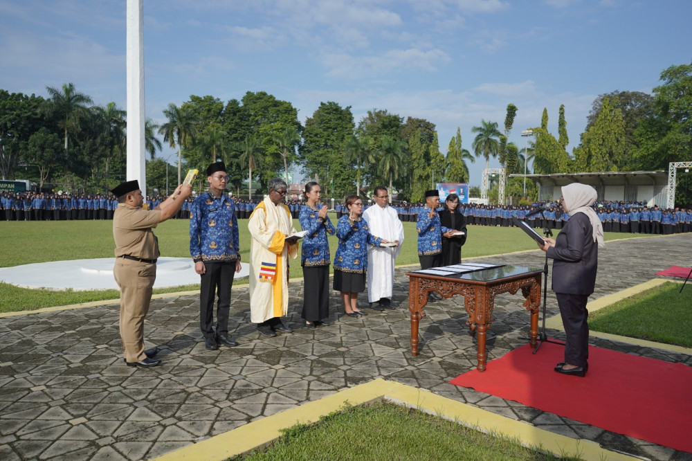 Jambinewsroom.com Jambi - Ribuan Pegawai Pemerintah dengan Perjanjian Kerja (PPPK) di lingkungan Pemkot Jambi, menerima Surat Keputusan (SK), Pelantikan dan Pengambilan Sumpah Janji serta Penyerahan secara Simbolis SK PPPK Kota Jambi 2023 itu dipimpin langsung oleh Penjabat (Pj) Wali Kota Jambi Sri Purwaningsih, di Lapangan Utama Kantor Wali Kota Jambi. Senin pagi (22/4/2024).