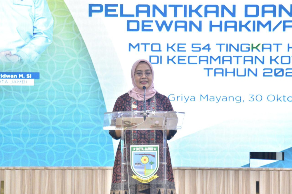 Jambinewsroom.com Jambi - Penjabat (Pj) Wali Kota Jambi, Sri Purwaningsih melantik Dewan Hakim dan Panitera Musabaqah Tilawatil Qur'an (MTQ) ke-54 tingkat Kota Jambi, bertempat di Aula Griya Mayang Rumah Dinas Jabatan Wali Kota, Rabu (30/10/2024).