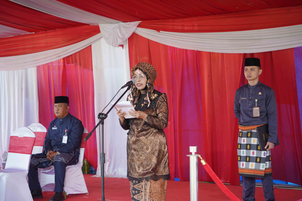 Mengenakan pakaian adat Melayu Jambi, pada upacara tersebut Sri membacakan amanat Gubernur Jambi.