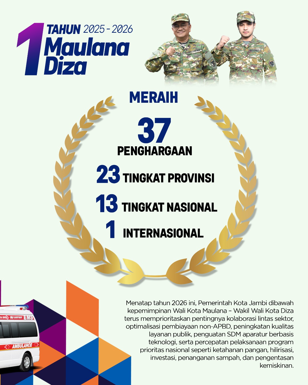 Jambinewsroom.com, Jambi - Pemerintahan Kota Jambi dibawah Kepemimpinan Wali Kota Jambi, Dr. dr. H. Maulana, M.K.M, bersama Wakil Wali Kota Diza Hazra Aljosha, S.E., M.A, menandai satu tahun masa bakti sejak dilantik Presiden Republik Indonesia Prabowo Subianto pada 20 Februari 2025 lalu, dengan capaian konkret di bidang ekonomi, kesejahteraan rakyat, dan Tata Kelola Pemerintah.