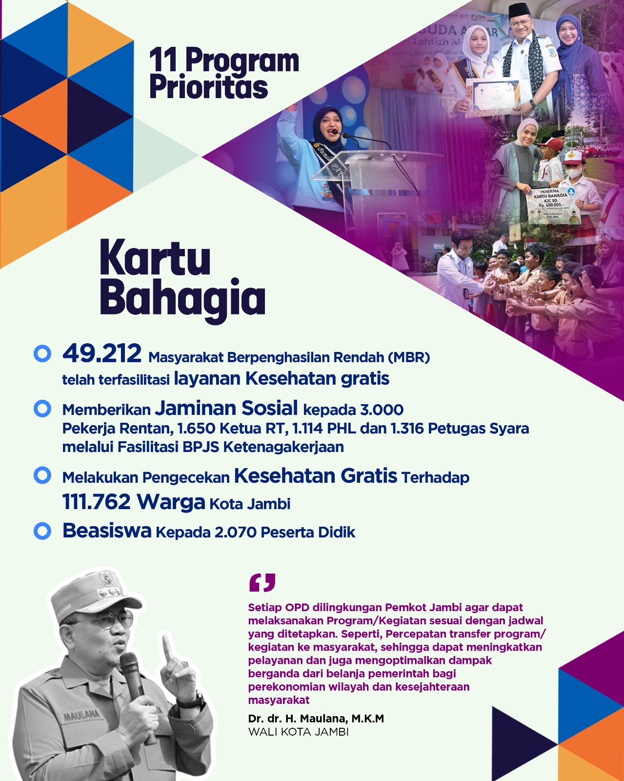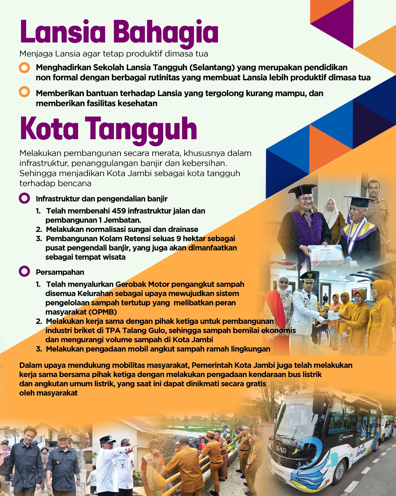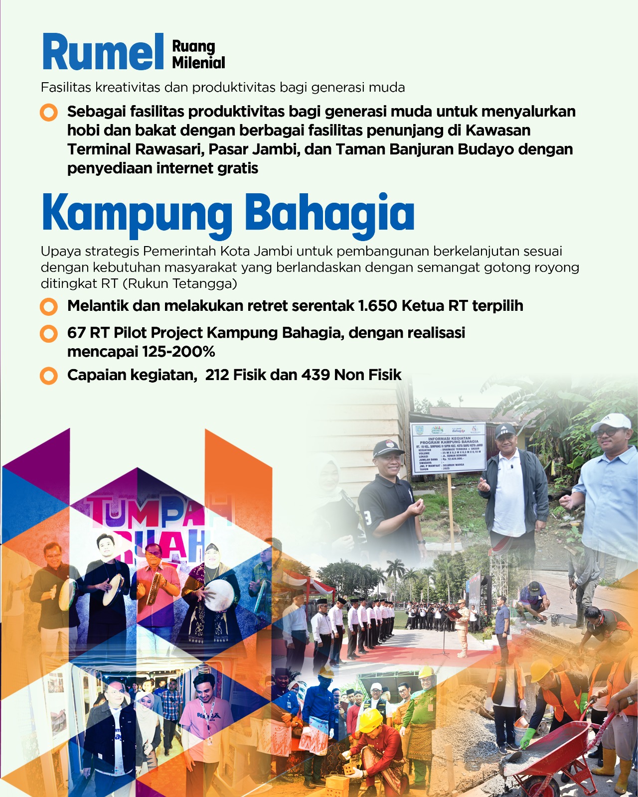 Melalui kerja nyata yang responsif berpijak pada visi Pembangun Kota Jambi Bahagia, dengan 11 program unggulan, yang berorientasi pada kebutuhan masyarakat, pemerintah menegaskan arah pembangunan berkelanjutan: melanjutkan yang baik, memperbaiki yang belum baik, dan memastikan hasil pembangunan dapat dirasakan langsung oleh rakyat yang berlandaskan kesejahteraan masyarakat.