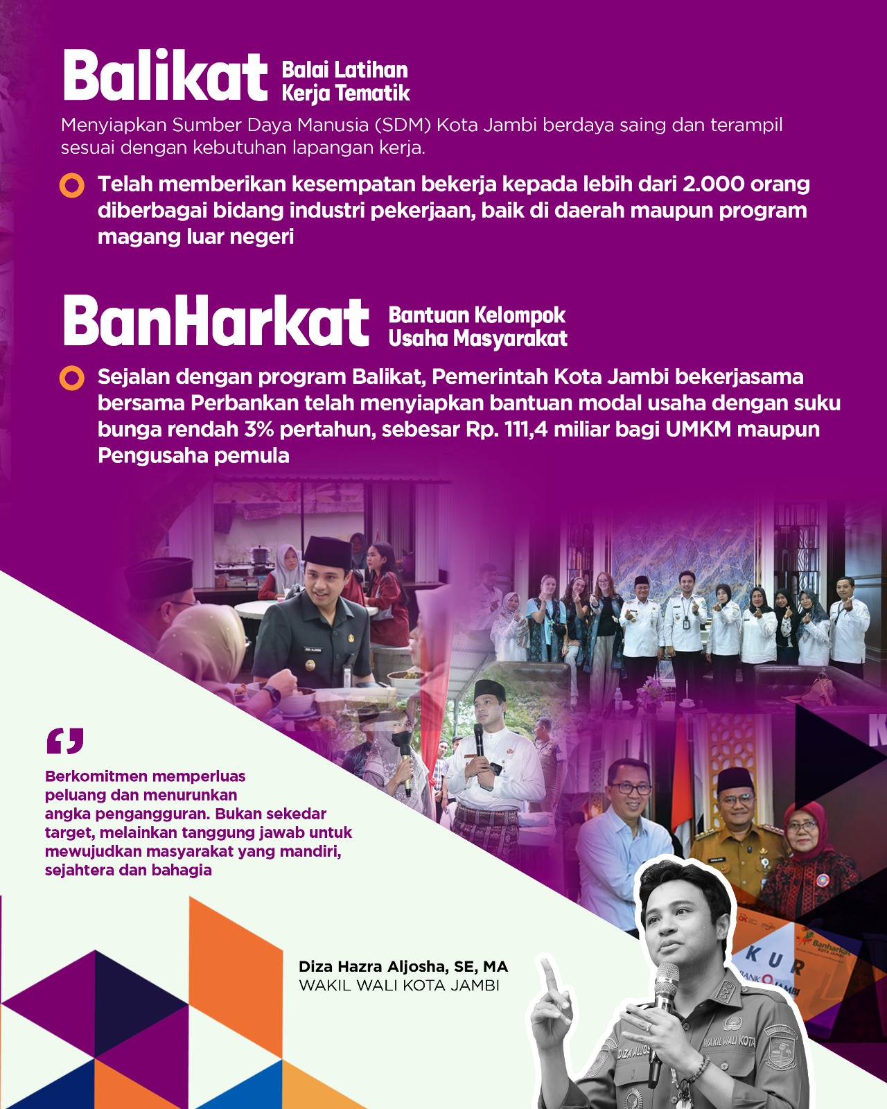 Stabilitas makroekonomi tersebut berdampak langsung pada peningkatan kesejahteraan masyarakat. Hal itu ditunjukkan pada angka kemiskinan Kota Jambi yang turun, dari 7.73% ditahun 2024 menjadi 7.69% ditahun 2025. Dengan target sebesar 6.70% ditahun 2030, mencerminkan investasi, dunia usaha dan ekonomi kreatif yang menyerap tenaga kerja semakin pulih.