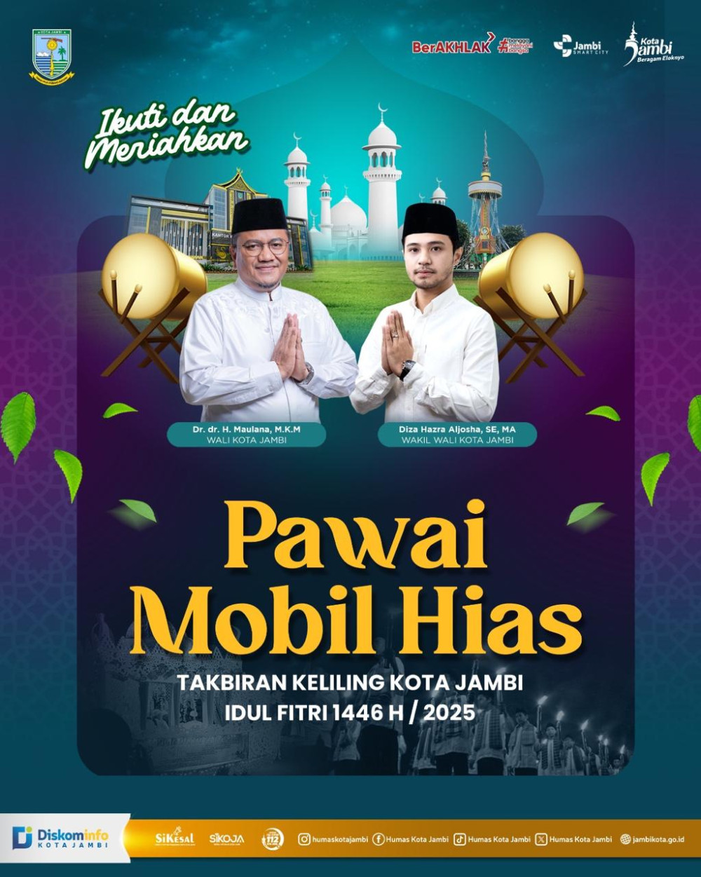 Jambinewsroom.com Jambi - Pawai Mobil Hias Takbiran Keliling menyambut Hari Raya Idul Fitri 1446 Hijriah akan kembali menyemarakkan kota Jambi. Pawai takbiran itu dijadwalkan akan dilepas secara resmi oleh Wali Kota Jambi dokter Maulana bersama Wakil Wali Kota Diza Hazra Aljosha serta unsur Forkopimda pada malam ini, Minggu (30/3/2025).