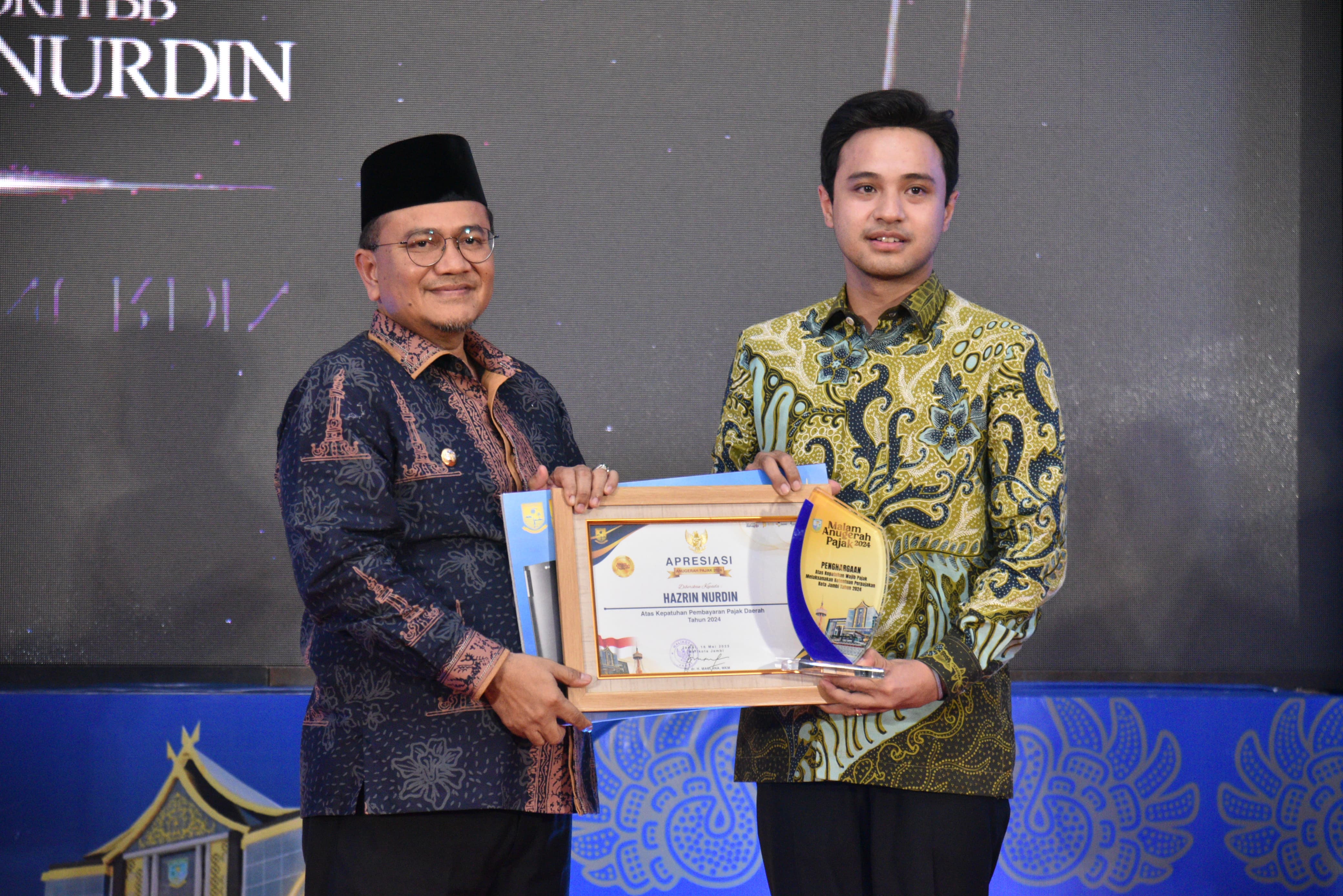 Jambi - Pemerintah Kota Jambi kembali menggelar agenda tahunan Malam Anugerah Pajak sebagai bentuk apresiasi kepada para wajib pajak yang taat serta berkontribusi nyata dalam peningkatan Pendapatan Asli Daerah (PAD). Acara prestisius yang dilaksanakan di salah satu hotel terkemuka di Kota Jambi pada Jumat malam (16/5/2025) itu, dihadiri langsung oleh Wali Kota Jambi, Dr. dr. H. Maulana, M.K.M., beserta jajaran Forkopimda dan stakeholder strategis lainnya.