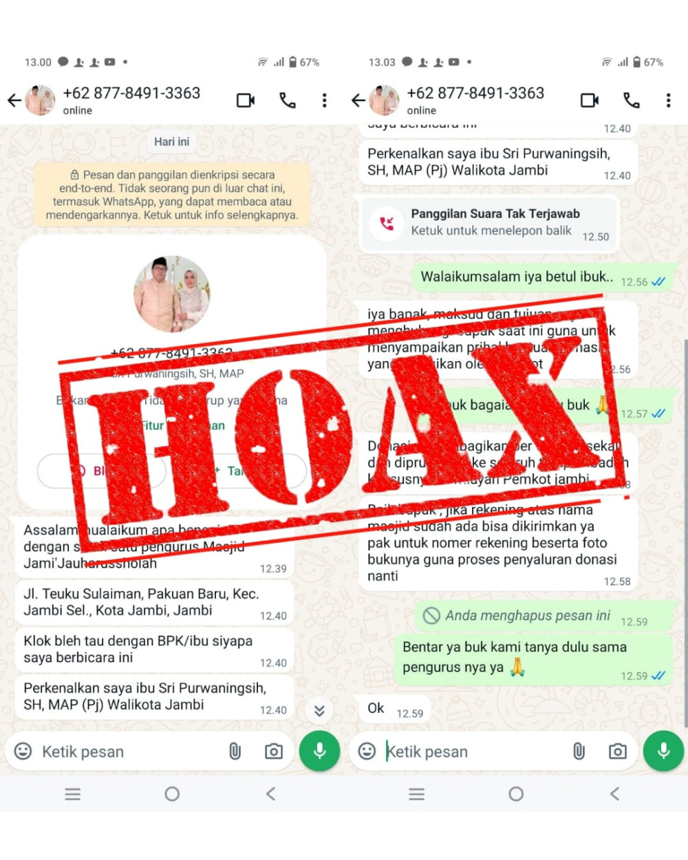 Jambinesroom.com Jambi - Dinas Komunikasi dan Informatika (Diskominfo) Kota Jambi menyebarluaskan pesan berantai terkait penipuan bantuan dana masjid yang disalurkan Pemkot Jambi. Pesan bantuan dana masjid yang mencatut nama Pj Wali Kota Jambi Sri Purwaningsih dipastikan pihak Pemkot Jambi adalah hoax atau penipuan.