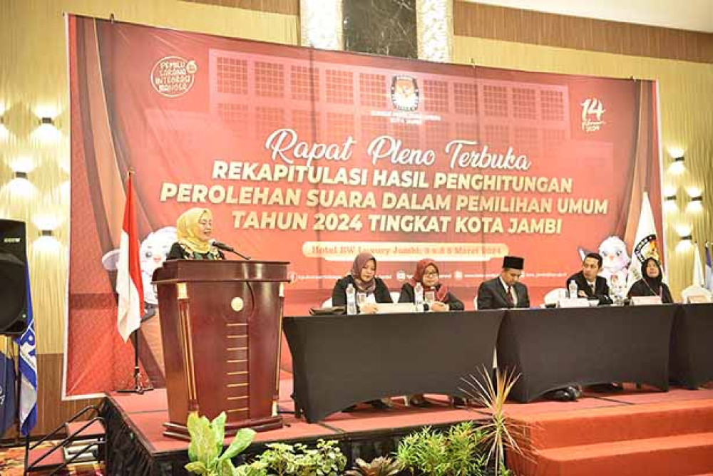 Jnr. Jambi - Penjabat (Pj) Wali Kota Jambi Sri Purwaningsih menghadiri Pembukaan Rapat Pleno Terbuka Rekapitulasi Hasil Penghitungan Perolehan Suara Pemilihan Umum (Pemilu) Tahun 2024 Tingkat Kota Jambi, Minggu (3/3/2024).