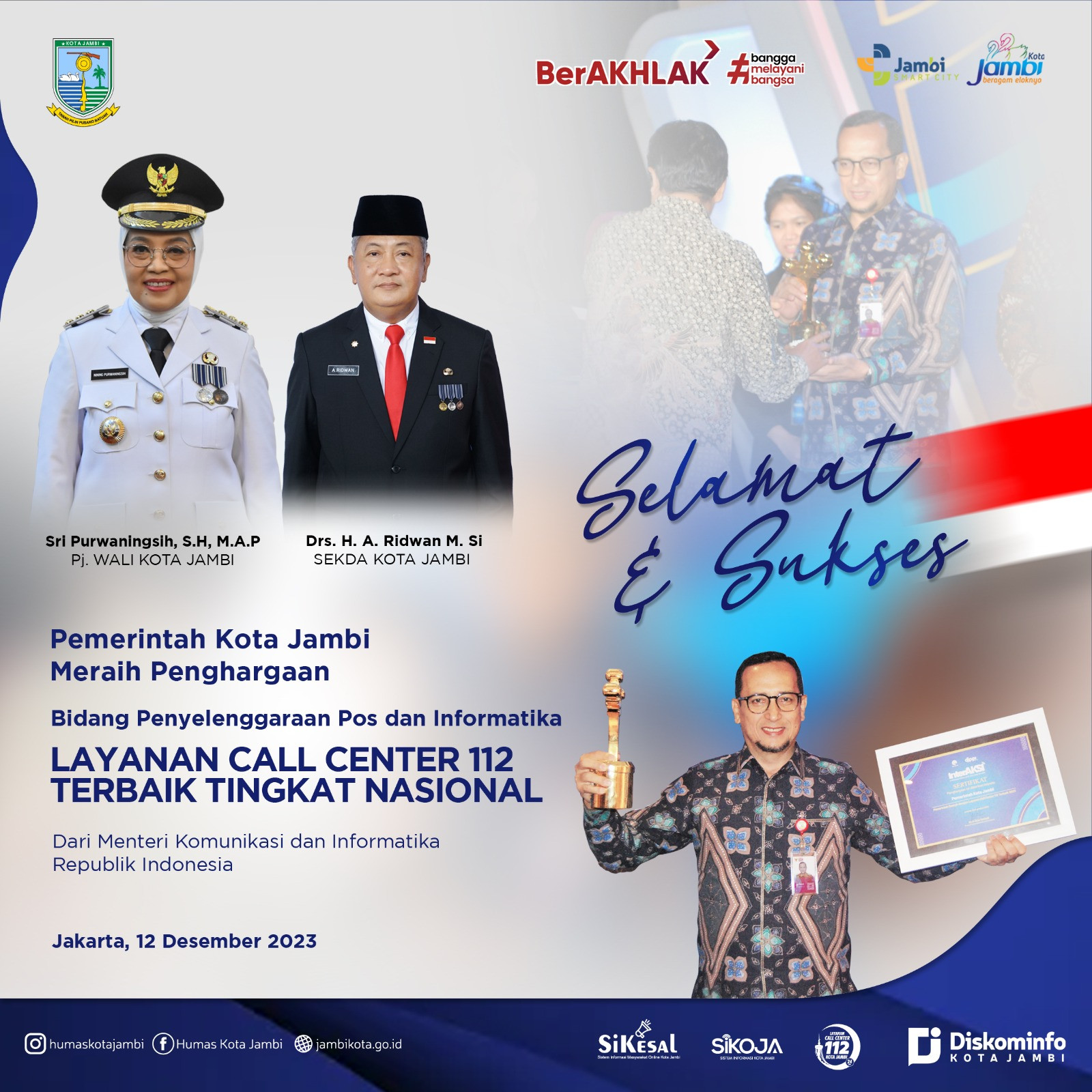 Penghargaan Layanan Call Center 112 Terbaik diterima oleh Kepala Dinas Kominfo Kota Jambi Abu Bakar atas nama Pemerintah Kota Jambi, dalam sebuah acara selebrasi yang berlangsung di Menara Danareksa, Jakarta. Penghargaan tersebut diserahkan oleh Direktur Pengembangan Pita Lebar Direktorat Penyelenggaraan Pos dan Informatika Kementerian Kominfo Marvel Situmorang, dalam acara yang bertajuk InterAksi (Indonesia Terkoneksi Siap Beraksi).