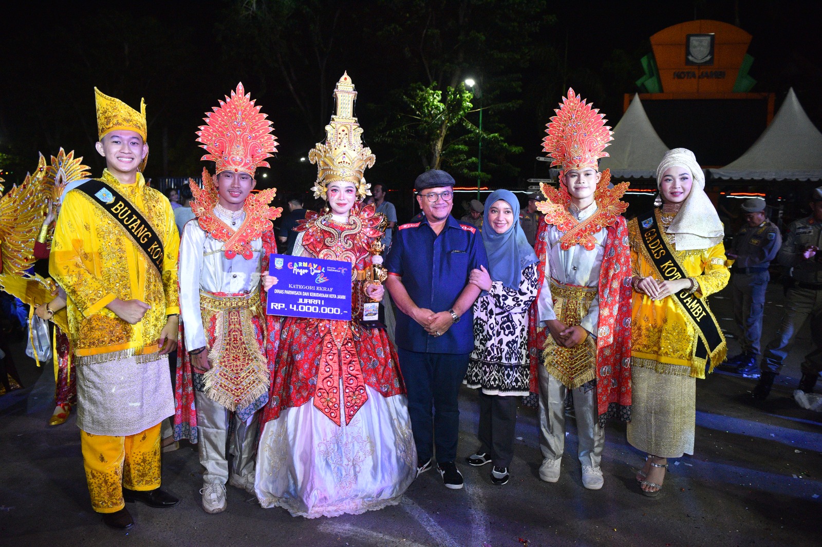 Suasana malam Kota Jambi tampak semarak dan penuh keceriaan, ditambah lagi dengan keunikan berbagai dekorasi dan kostum peserta, serta ragam penampilan apik peserta karnaval, mampu memukau masyarakat yang memadati kawasan Tugu Keris Siginjai dan sepanjang jalan protokol yang menjadi rute karnaval tersebut. Hadir menerima peserta karnaval dipanggung kehormatan, Wakil Wali Kota Jambi, dr. H. Maulana.